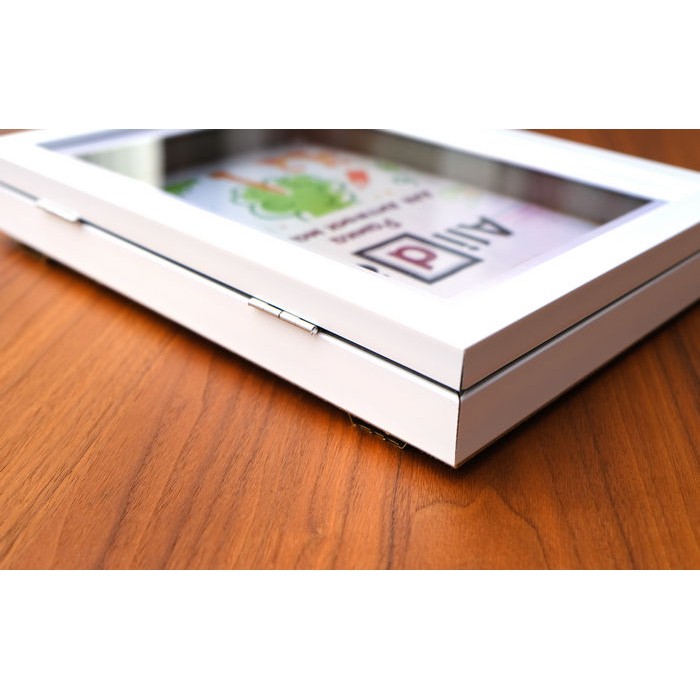 Коробка для детских рисунков белого цвета, которую можно использовать как накопитель, где вы можете осторожно хранить шедевры вашего ребенка, а также повесить его на стену в виде рамки.