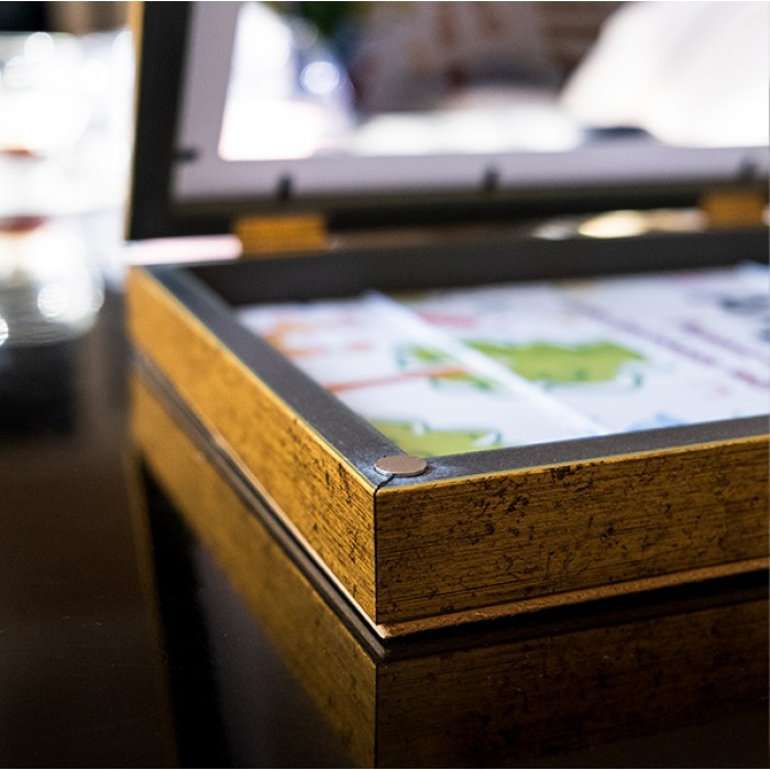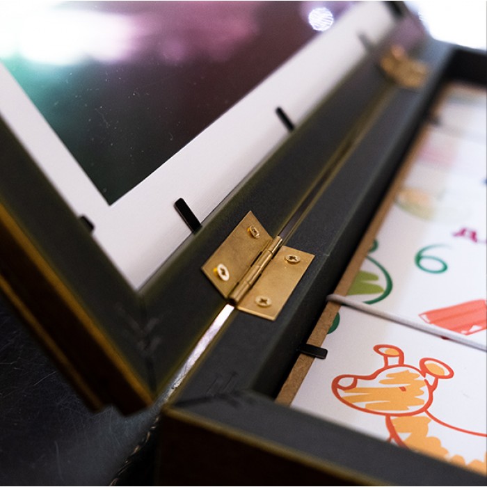 Дно коробки оснащено резинкой, держащей ваши рисунки внутри.